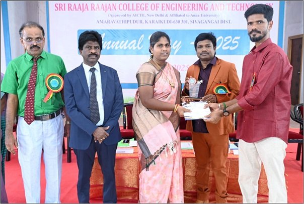 The following Staff Members received "Best Meritorious award in 2025" from the management of ”SRI RAAJA RAAJAN COLLEGE OF ENGINEERING AND TECHNOLOGY, KARAIKUDI", for producing good academic results.