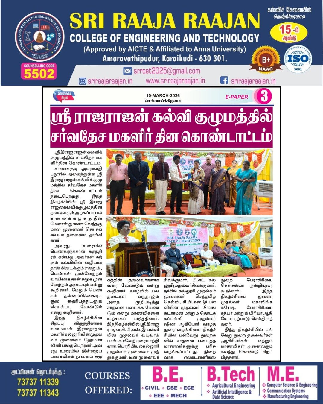 Sri Raaja Raajan College of Engineering and Technology was established in 2010 by Sri Muthumari Charitable and Educational Trust with a view to create an Engineering Degree Institute to fulfill the long felt public need of an Institute of Excellence in Karaikudi. The trust is located at Karaikudi. Sri Muthumari Charitable and Educational Trust is assisted by the Governing and Advisory Council in matters of Policy, Planning and Development of the Institutions.